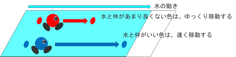 - すると、水と仲がいい色は水と一緒にどんどん広がっていきますが、仲があまり良くない色はなかなか一緒に広がっていきません。