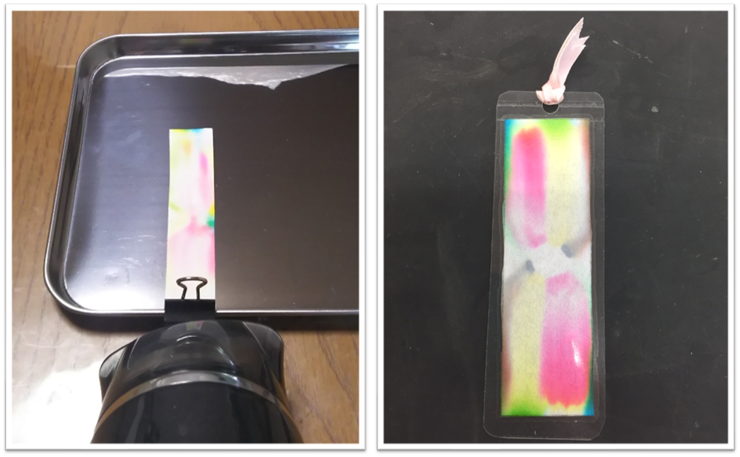 - あとはラミネートなどで適当に仕上げたら、クロマトしおりの完成です。