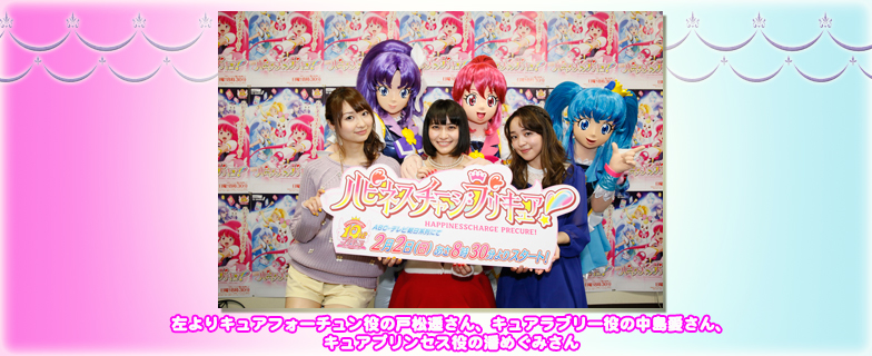 戸松遥(とまつはるか)「自分がプリキュアを演じさせて頂けるなんて、ホントに夢のようで、すごく嬉しいです。自分も女の子としてプリキュアで育ってきた世代なので、今度は見て下さる女の子たちに夢や希望やハピネスを与えられるように精一杯がんばっていきたいと思います!」