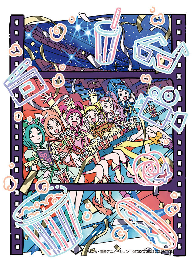 najucoさんはYes!プリキュア5の衣装を基調に(※ミルキィローズは「Yes!プリキュア5GoGo! 」仕様)、アイスクリームショップを背景に談笑しているようにも見える鮮やかなイラストに。丸紅さんは、映画館での秘密の上映会をテーマに、Yes!プリキュア5GoGo!