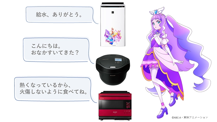 毎日の挨拶に加え、空気清浄機ではお部屋の空気の状態や本体のお手入れタイミングを、「ヘルシオ」や「ホットクック」ではおすすめメニューの提案などを、各キャラクターのオリジナル音声で発話します。