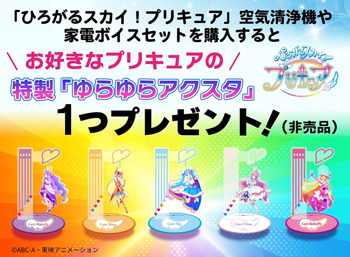 「空気清浄機カスタマイズサービス『ひろがるスカイ!プリキュア』」、またはカスタマイズ音声とのセット商品をご購入いただいたすべての方に、描き起こしイラストを使用したオリジナルのアクリルスタンドをプレゼントします。購入時に、全5種類からお好きなキャラクターを1つお選びいただけます。