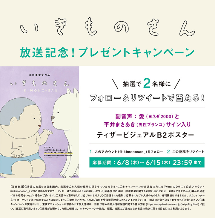 - 本キャンペーンの当選者の方にはTwitterのDMにて公式アカウント(@ikimonosan_)よりご連絡しますので、フォローは外さないようにお願いします。