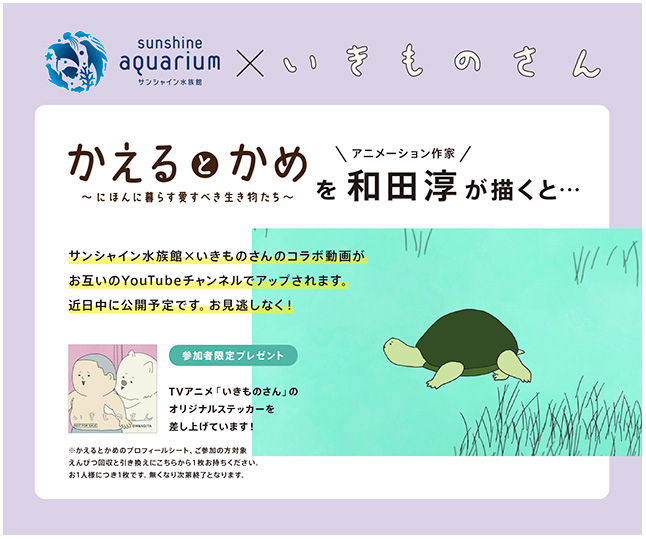 会期中にいきものさんとサンシャイン水族館のコラボ動画がそれぞれのYouTubeチャンネルで公開されます。またイベントにお越しいただき「かえるとかめのプロフィールシート」ご参加の方に「いきものさん」オリジナルステッカーをプレゼントいたします。是非お越しください。
