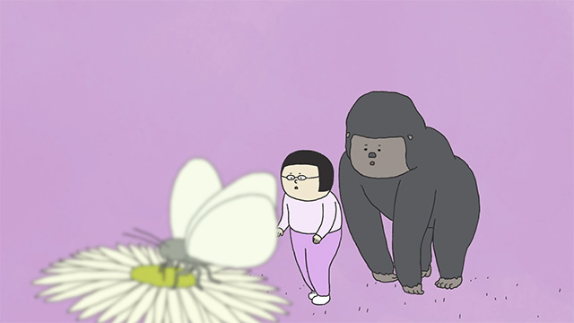 第9話チョウの回に新キャラクター「ゴリラ」が登場。ゴリラ役の担当は男性ブランコの平井まさあきさんです。今回登場する女の子役は愛さん(ヨネダ2000)が担当で、副音声で担当されていたお2人がついに本編に登場します。