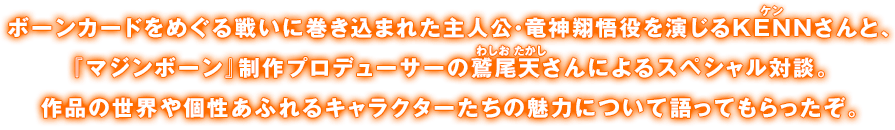 KENN:僕らとしてもすごく心強いですよ。やっぱり大勢いてくださるっていうのは。鷲尾さんが毎回僕らとコミュニケーションをとろうとしてくださるのもすごく嬉しいんです。「昨日発表会があったよ」とか、「マジンボーン実機が稼働しますよ」とかそういう情報も、アフレコのときに教えてもらえるし。意外と僕らって細かい部分を知らされない事があるので、そういうふうに情報を共有できる環境っていうのはものすごく恵まれているなぁって思いますね。