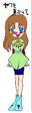 | 投稿2回目です。ヤクモの夏服ってこんな感じ・・・?と思いつつ描いたもので す(笑) ホントはミニスカにしたかったんですが、風吹いたりしたら・・・・・・・・・ ・。 でも・・・・・・・・もう冬なのに夏服を描いてしまう私って・・・・・・・・ ・・・・・・(大汗) | |