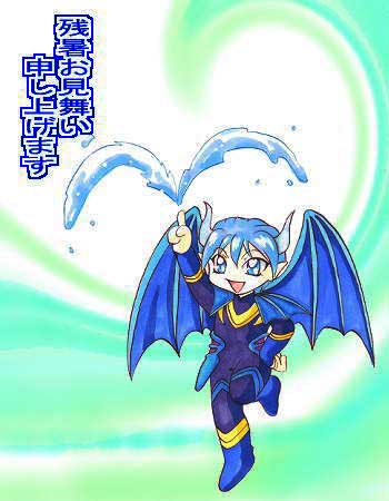 [管理人より]火賀さんからいただいた残暑見舞いのイラストを、ご厚意によりUPさせていただきました。どうもありがとうございました!キャラのアレンジの可愛さもさることながら、それを引き立てているこのポーズ!。何ともオチャメと言いますか、見事にハマっている所がスゴイです(^^)。