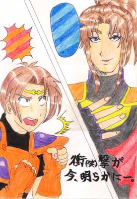 「マシュランボー」を見始めた頃、OPに登場するマシュランボーを「マシュラの生き別れの兄」だと思っていました。今考えると笑える事だけど、当時は彼の登場シーンまで(ストーリー中盤で、ヤクモをさらいに来るとか)想像していました。イラストには「衝撃が今・・・」と書きましたが、本当は「衝撃の真実が今、明らかに−。」と、するつもりでした(汗) |