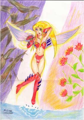 | 第26話に登場した、ピクシーカードリアンです。たった1話の登場だったけれど、魅力的なキャラだったので描いてみました。ピクシーがやけに黄色いのは、花を摘んでいる最中、花粉を浴びてしまったというシチュエーションをイメージしてみたからです。背景は、ピクシーの美しさと残忍さをイメージしています。 |