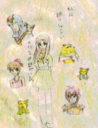 | [管理人より]小学校を卒業されたまなぷ〜さんから、久々の投稿です。いただいた画像がぼやけ気味だったのですが、ヤクモの周りにイメージ的に浮かぶキャラや色使いなど、これはこれで、不思議な雰囲気を持った作品に仕上がっていると思います。卒業後も「マシュランボー」を応援して下さるとのコメントもいただきました。こちらこそ、これからもよろしくお願い致します。 |