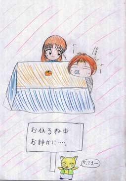 「みんなで大笑い。」今回はみんなの笑い顔(バカ笑い)を描いてみました!!後ろの方、小さくて見えにくいかもしれませんが、皆いますよ。(テキトーだけど・・・。)しらけてます。それにしても、何を見て笑っているんでしょう?けっこう上手く描けて良かったです。 「春の昼下がり。」ヤクモとビンカの2ショットです!!私としては、ヤクモがめずらしく上手く描けたと思います。 「こたつでおひるね。」とにかくかわいい2人を描きたかったんですが・・・。ちょっとこたつは季節外れですね。 |