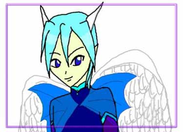 | 今回のイラストは、サーゴがマシュラのカードを取り込んだら、どんな姿になるのか な?と思い、描いてみました。 属性はそのまま水ですが、鳥族並の飛行能力があります。 翼は、赤っぽくしようと思ったのですが、上手くいかなかったので白にしました。 本当は、マシュラのメットをイメージして、仮面でもつけようと思ったのですが、妖 しくなったので止めました(笑) |