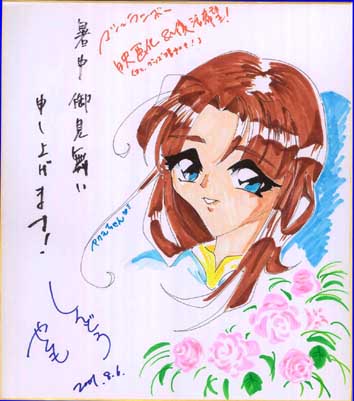 [管理人より]神童八雲さんから色紙でいただきました。どうもありがとうございました!(色紙では”暑中見舞い”になっていますが、立秋を過ぎましたので、タイトルでは”残暑見舞い”にしてあります。ご了承下さい。)色紙にあるメッセージ、大変嬉しく思うと共に、私も心から願っています。こういうタッチのアレンジのヤクモは、なかなか新鮮な印象を受けますね。