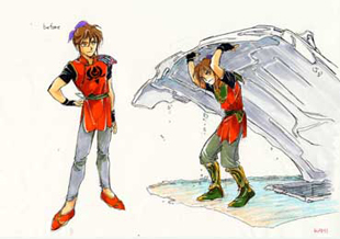 決定稿に近いリュウマのラフスケッチ。金髪や、目がアブなくなるのは、この頃から決定していたようです。書き文字を見ると、巻毛になったのは、神村さんのシュミのようですが?