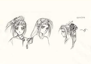 神村さんが促ボツにしたという、ヤクモの第1稿。理由は、「お姫様っぽい髪型」をイメージにスケッチを起こしたものの、描くのに手間がかかり過ぎるから。真ん中のスケッチは、決定稿に近いですね。