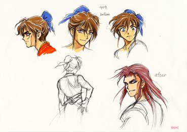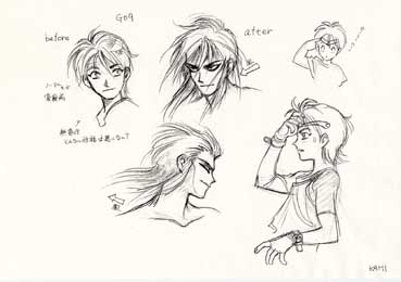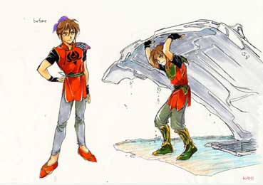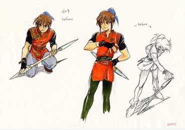 | マシュラ初期稿のポーズ集。神村さんのサイトによれば、「強く美しく変身するのに、変身前からカッコ良すぎる」という理由で、ボツ。イメージは孫悟空。髪の色は、おサルの毛色を意識したそーです。 | マシュラ初期稿のコスチューム・バリエーション。基本的なデザインに大差がないです。ちなみに、ヤクモより一つ年下だけど、身長は同じという設定だったとの事。 |