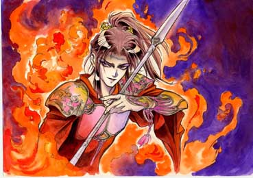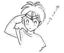 | ハイパーマシュラ第1稿のコスチューム・バリエーション。左のデザインの生腕が妙になまめかしいような・・・。武器のデザインは、サーゴに受け継がれています。 | オマケです。マシュラ初期稿のスケッチにあった、落書きです。さすがにサークレットを投げるという技は、無かったようです(笑) |