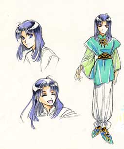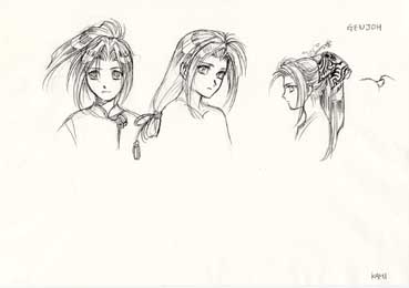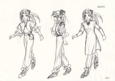 | 神村さんが促ボツにしたという、ヤクモの第1稿。理由は、「お姫様っぽい髪型」をイメージにスケッチを起こしたものの、描くのに手間がかかり過ぎるから。真ん中のスケッチは、決定稿に近いですね。 | ヤクモ第1稿のコスチューム・バリエーション。こちらも、同様の理由でボツになったと思われます。キャラ名は「GENJOH(玄奘)」となっていますが、多分、仮のものでしょう。 |