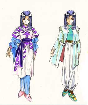 | ヤクモの第2稿。見ての通り、細かい部分以外、ほとんど決定稿と同じです。それだけ、すんなりと決定したようです。作画の負担にならないようなデザインにしたそうですが、実際はそうでもなかったとか・・・ | ヤクモ第2稿のコスチューム・バリエーション。左のデザインが1番人気だったそうですが、「模様を動かすのが大変」という理由でボツ。それにしても、決定稿を見なれていると、どちらも新鮮に見えますね。 |