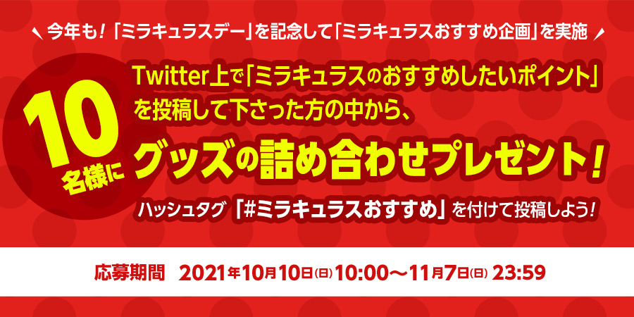 絵、文章、写真、映像、音楽、立体物、コスプレなど形式問わず、ハッシュタグ 「#ミラキュラスおすすめ」 を付けてTwitter上で『ミラキュラスのおすすめしたいポイント』を投稿して下さった方の中から、 ミラキュラス公式が厳正かつ情熱的に審査を行い、「おすすめポイントに共感できる」または「作品愛を感じた」10名様を決定いたします。