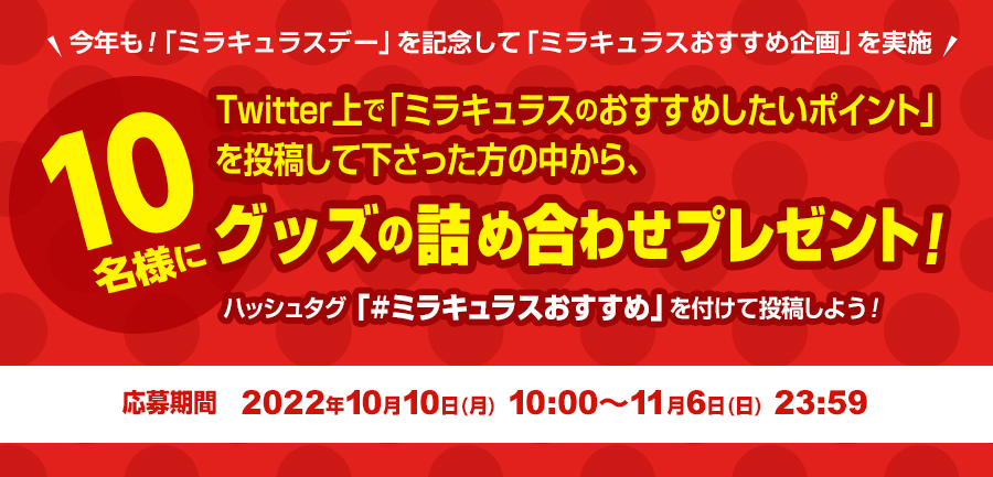 絵、文章、写真、映像、音楽、立体物、コスプレなど形式問わず、ハッシュタグ 「#ミラキュラスおすすめ」 を付けてTwitter上で『ミラキュラスのおすすめしたいポイント』を投稿して下さった方の中から、 ミラキュラス公式が厳正かつ情熱的に審査を行い、「おすすめポイントに共感できる」または「作品愛を感じた」10名様を決定いたします。
