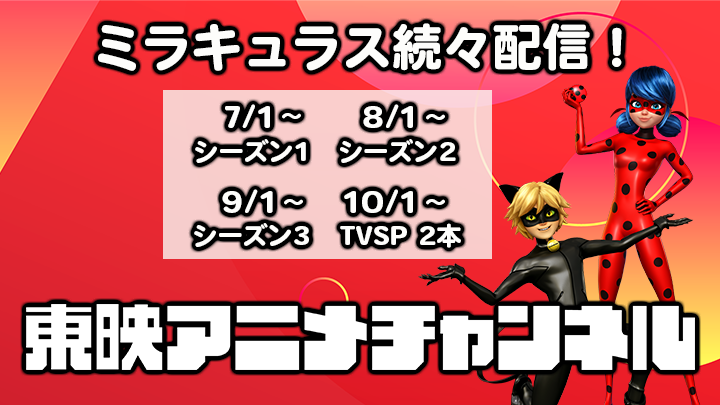 見放題サービス「東映アニメチャンネル」にて「ミラキュラス」シーズン1~3とTVSPが順次配信開始となります。