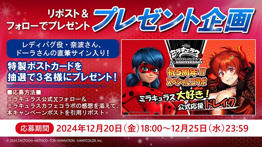 - 当選のご連絡は、応募期間終了後、「ミラキュラス レディバグ&シャノワール公式 (@miraculousjp)」からX内ダイレクトメッセージでの通知をもって代えさせていただきます。ダイレクトメッセージを受け取れるよう、ご設定をお願いいたします。