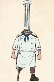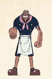 バラティエの名物コックの1人で、パティのよき相棒。バラティエの海戦兵器「サバガシラ1号」のパイロットでもある。