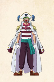 バギー海賊団船長で、元はロジャー海賊団で見習いをしていた。バラバラの実の能力者。自分の丸くて赤い鼻に極度のコンプレックスを抱いているため、少しでもいじられると烈火のごとく怒る。インペルダウンからの脱獄後、マリンフォードでの頂上戦争に参戦する羽目に。偶然が重なり、他の脱獄囚から畏敬の念を抱かれている。