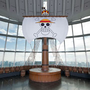 入場すると先ず、尾田先生のメッセージと、高さ約7.5メートルのサウザンド・サニー号のマストがお出迎え! サウザンド・サニー号のバックには52階からのパノラマビューが広がります!