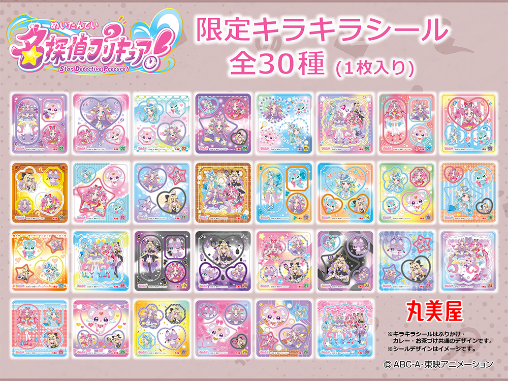 共通の丸美屋オリジナル「プリキュアキラキラシール」(全30種)1枚入りです✨(キャラめんトッピングには、シールはついておりません。)