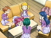 まず、のぞみたちはもう一度、送られてきたものを調べなおしてみましたが、そこには「V」の文字が書いてありました。でもよく見ると、それは書いた文字ではなく、何かでつけられた跡のようです。謎は深まるばかりでしたが、のぞみは「模様のついた紙切れ」に残された匂いから、それが新装開店された時計塔というクレープ屋さんのチラシの切れ端だということに気付きました。二つの謎の共通点が「時計」だったことから、みんなは町のシンボルの時計塔へと行ってみることにします。しかしここで寝泊りをしているシロップでさえ、手紙の送り主が誰かはわかりません。そこへ突然、スコルプが現われました! |