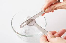 計量スプーンに材料を山もりにすくい、別の計量スプーンの持ち手で、はしからふちをすべらせてすり切ります。