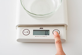 電子スケールを平らなところに置いて、ボウルなどの容器を乗せたらスイッチを入れ、目もりが0gになったのを確かめて材料を入れて計ります。