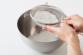 こし器などに粉を入れて、横を手でトントンとたたいて粉を下に落としていきます。粉をふるうと、粉のかたまりが無くなり、空気をよく含み、生地をふんわり焼き上げることが出来ます。粉をふるわないと、かたまりが残り、ふくらみの悪いスイーツになってしまいます。ベーキングパウダー、ココアのなどいくつかの粉がある場合はあらかじめあわせてふるっておきます。