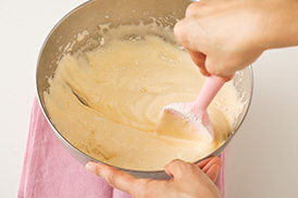 ヘラをたてに動かして、生地を切るようにしながら混ぜます。混ぜすぎには注意しましょう。