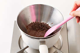 卵やバターが冷たいと、他の材料とうまく混ざりません。冷蔵庫から出した卵やバターは、15分くらい室内において置きます。(室温目安:25°C)湯せんにかける
