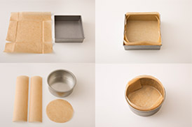 あらかじめ型に紙をしいておきましょう。きれいに敷くと出来上がりもきれいに仕上がります。