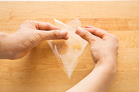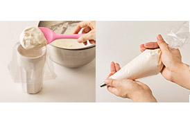 入れ方:絞り出し袋を高さのある入れ物に入れ、縁を折り返します。絞り出し袋に入れる材料は、半分くらいまでがベストです。