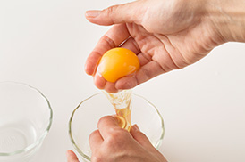 コシの強いメレンゲを作るために、卵白と卵黄が混ざらないようにきっちりと分けましょう。冷蔵庫で冷やした卵を小さな容器に割りいれて、手で卵黄をやさしくすくい取りましょう。くっついてきた卵白は手で下に落とします。
