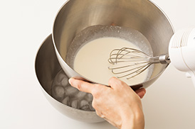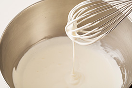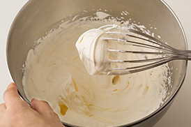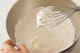 デコレーションケーキに絞り出す時や、クレープやプリンにそえる時に使います。クリームを泡だて器ですくった後、しっかりつのが立ち、つのの先が下を向くくらいが目安です。