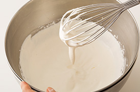 スポンジケーキの表面に塗って、仕上げるときに使います。泡だて器を持ち上げると、クリームがリボン状に落ちるくらいが目安です。