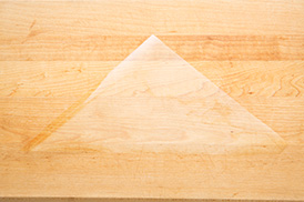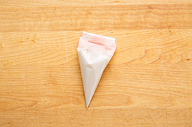 コルネとは、三角形のシートやオーブンペーパーなどを巻き上げて作る円すい状の絞り袋のこと。中にアイシングやチョコレート、クリームなどを入れて先端を切り、絞り出します。細い線をかきたいときに使います。