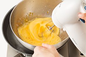 フライパンに水を入れて火にかけて50度くらいになったら(ふつふつと小さな泡が出てきたら)<1>を湯せんにかけてハンドミキサーで泡立てます。卵液が人肌(36度くらい)になったら、