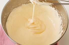 泡立て器ですくうとゆっくり落ちて生地が重なりリボン状になるまで、<2>をハンドミキサーでさらにしっかりと泡立てます。