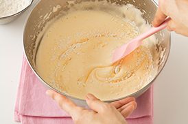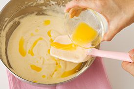 <3>に牛乳を加え、泡立て器でよく混ぜ合わせます。薄力粉を半量ふるい入れて、ゴムベラで粉が見えなくなるまでざっくりと混ぜます。