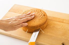 スポンジケーキのオーブンペーパーを取り、ケーキを2枚に切ります。