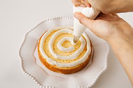 1枚目のスポンジを皿に置き、クリームを全体に絞り出します。