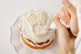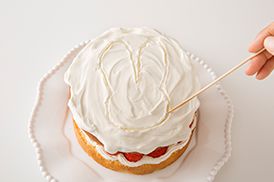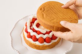 いちごの上にクリームを絞り出し2枚目のスポンジをのせます。このとき全部を絞らず、飾り用のクリームを残しておくこと。残ったクリームは冷蔵庫で保管します。